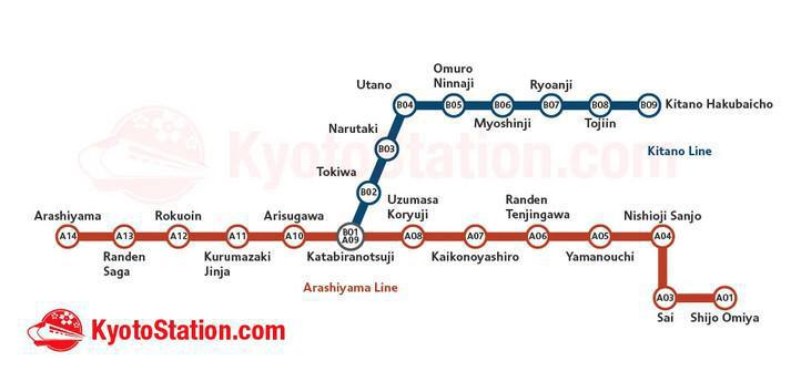 The Keifuku Randen Tram Line is operated by the private company Keifuku Electric Railroad. The Randen actually consists of two lines in the west of Kyoto city. The Arashiyama Line runs east –west from Shijo-Omiya Station to Keifuku Arashiyama Station. The Kitano Line branches from the Arashiyama Line at Katabiranotsuji Station and runs north to Kitano-Hakubaicho Station.